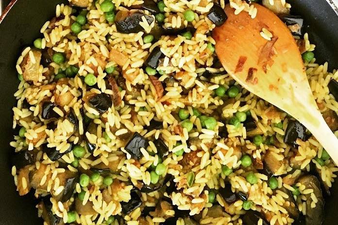Máma dvou dětí Maria vaří @bez_lepku_mleka_cukru. Miluje kombinaci kari rýže s hodně restovaným, až skoro smaženým, lilkem. K tomu přidá uvařené vajíčko natvrdo a má báječný oběd za tepla i studena do krabičky.