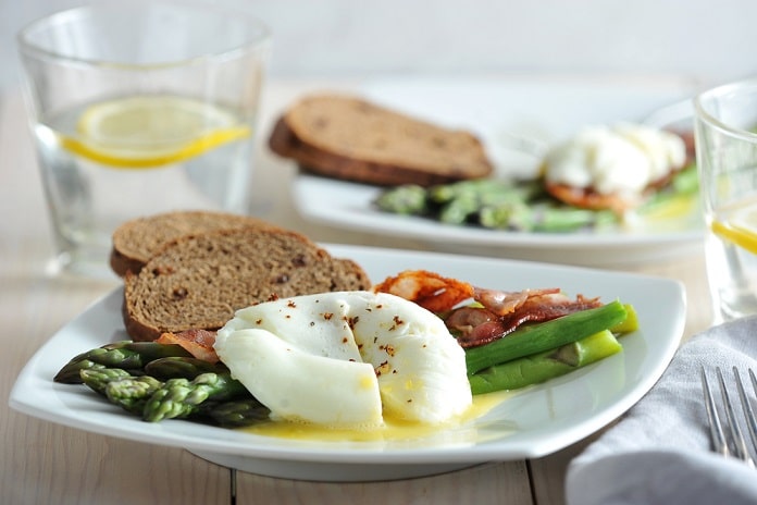 Večeře: Blanšírovaný chřest s prosciuttem a ztraceným vejcem, celozrnné pečivo