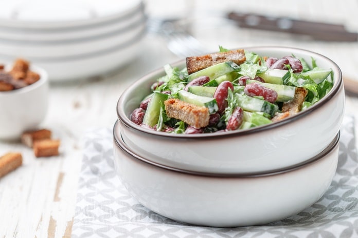 Večeře: Listový salát s okurkou, červenými fazolemi, jogurtem a celozrnnými krutony