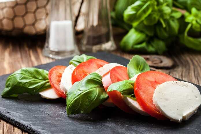 Svačina: Salát caprese s rajčaty, mozzarellou a čerstvou bazalkou