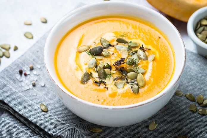 Večeře: Mrkvová polévka s kari, dýní, kokosovým mlékem, zázvorem a koriandrem