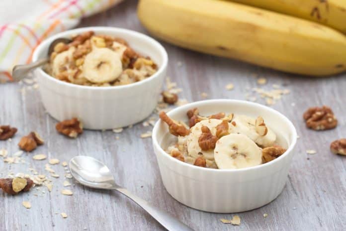 Snídaně: Domácí oříškové müsli s rozinkami a banánem