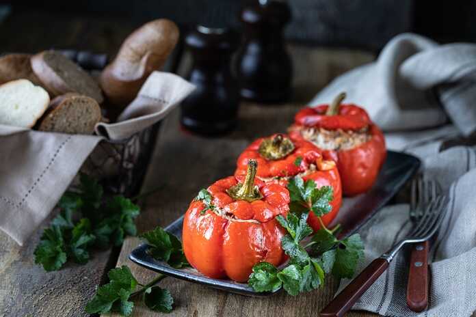 Oběd: Papriky plněné mletým drůbežím masem s rýží a rajčatovou omáčkou