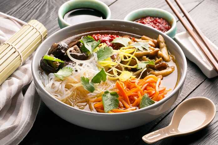 Večeře: Polévka z bílé ředkve, hub shiitake, jarní cibulky a mungo klíčků