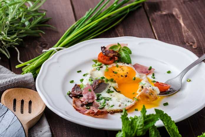 Snídaně: Volské oko s krůtí šunkou, pažitkou a čerstvou zeleninou, celozrnný žitný chléb