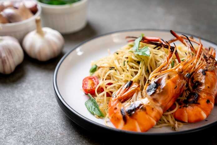 Večeře: Celozrnné špagety s krevetami podušené na bílém víně s česnekem, rajčaty a čerstvými bylinkami