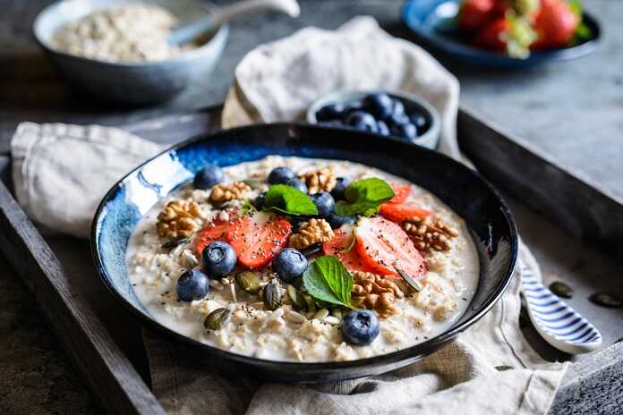 Snídaně: Ovesné vločky s lněnými semínky, chia semínky, lesním ovocem a vlašskými ořechy, zalité rostlinným mlékem