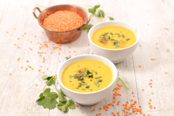 Večeře: Zeleninová polévka zahuštěná červenou čočkou, žitný chléb