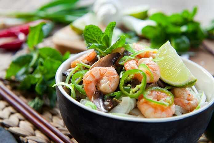 Večeře: Rýžové nudle s krevetami, chilli papričkami, česnekem, pórkem a arašídy