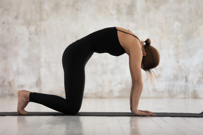 - Skloňte hlavu, nechte ji volně viset dolů a ohněte celou páteř ke stropu.