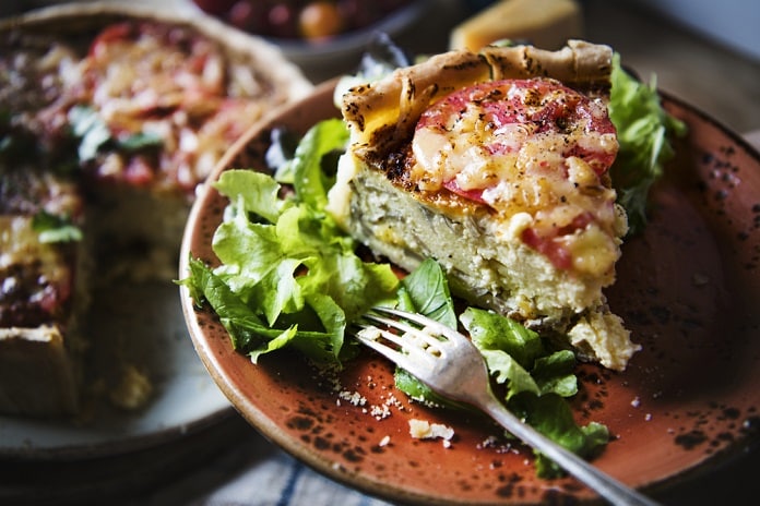 Oběd: Celozrnný quiche s cibulí, rajčaty a nízkotučným tvrdým sýrem