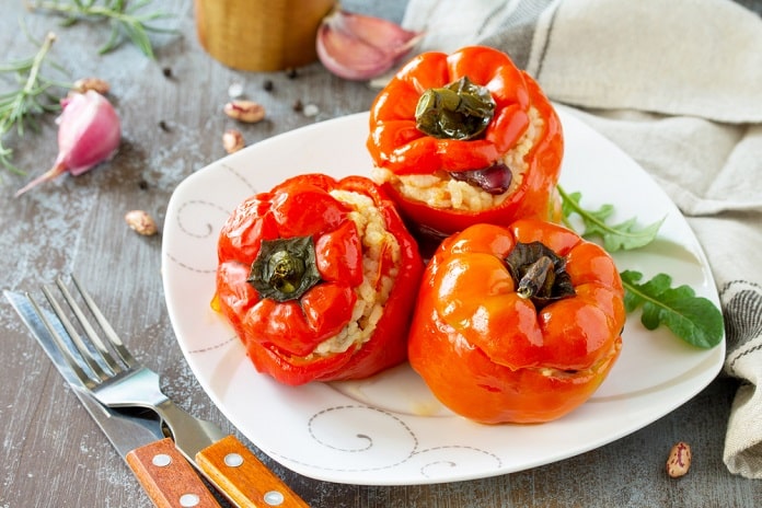 Oběd: Plněné papriky pikantní fazolovou směsí s celozrnnou rýží