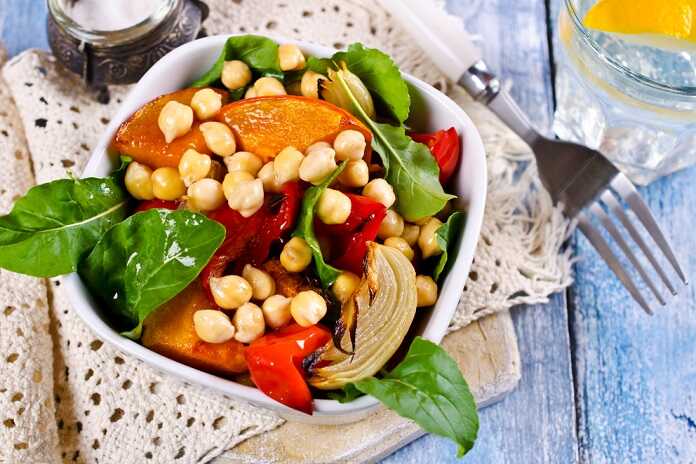 Večeře: Listový salát s pečenou dýní, cizrnou, bazalkou, konopnými semínky a grilovanou paprikou
