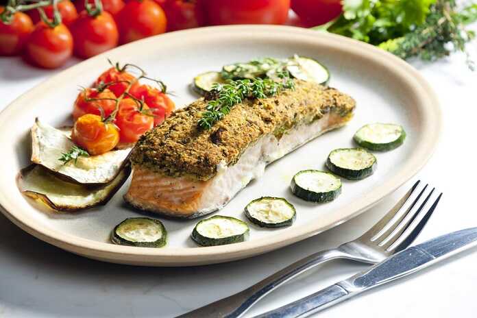 Večeře: Pečený losos v sezamové krustě s grilovanou středozemní zeleninou