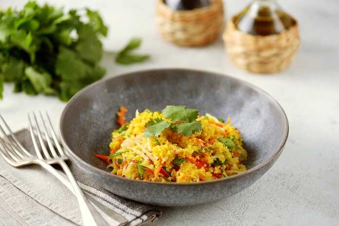 Večeře: Listový salát s kuskusem, kurkumou, ředkvičkami, okurkou a mrkví