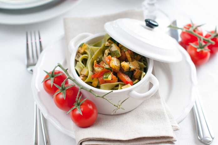 Oběd: Salát z celozrnných těstovin, kuřecího masa, rajčat, cukety a lilku