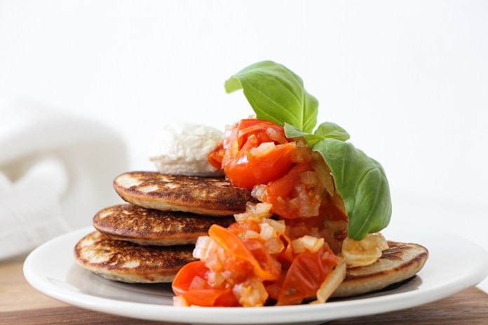 Snídaně: Pohankové lívance s mandlovým sýrem a rajčatovým soté