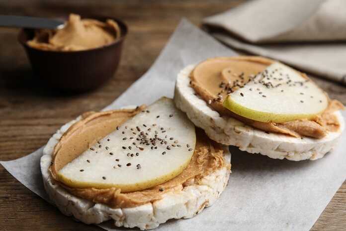 Svačina: Rýžové chlebíčky s mandlovým máslem a hruškou