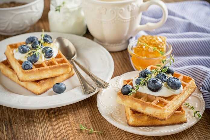 Snídaně: Vafle s kokosovým jogurtem, medem a borůvkami