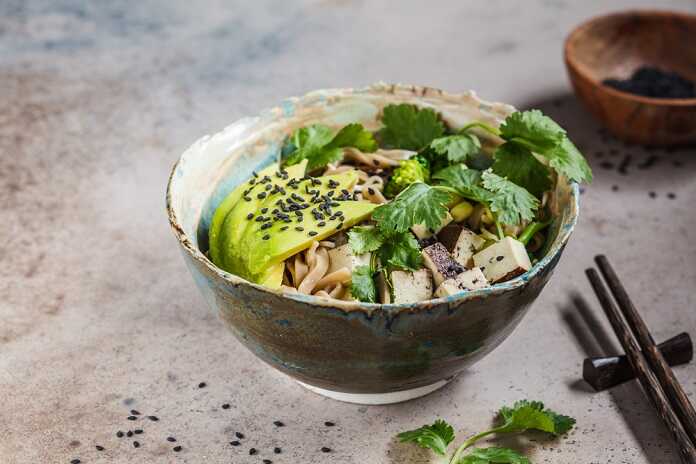 Oběd: Pohankové nudle s tofu, brokolicí, avokádem a čerstvou mátou